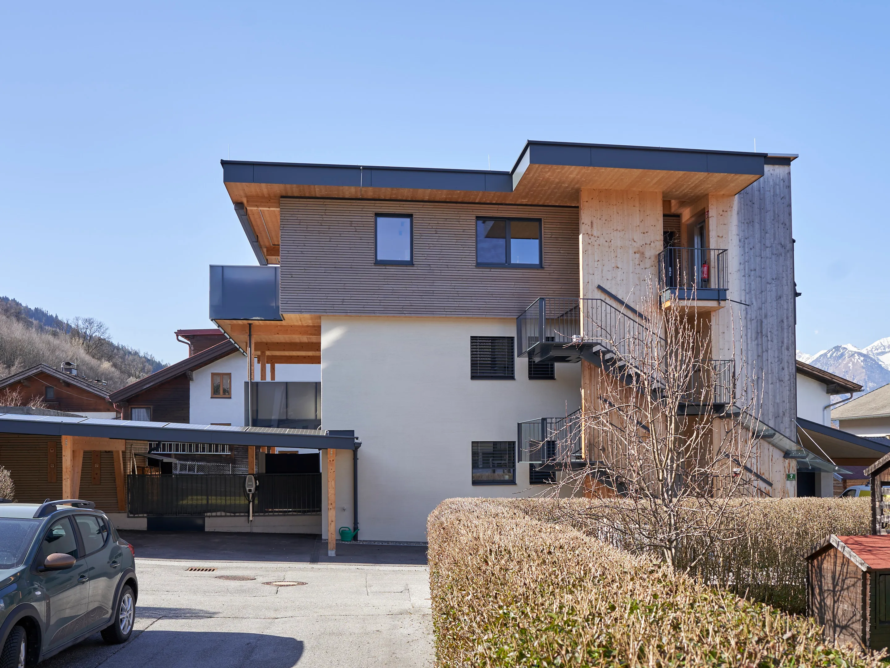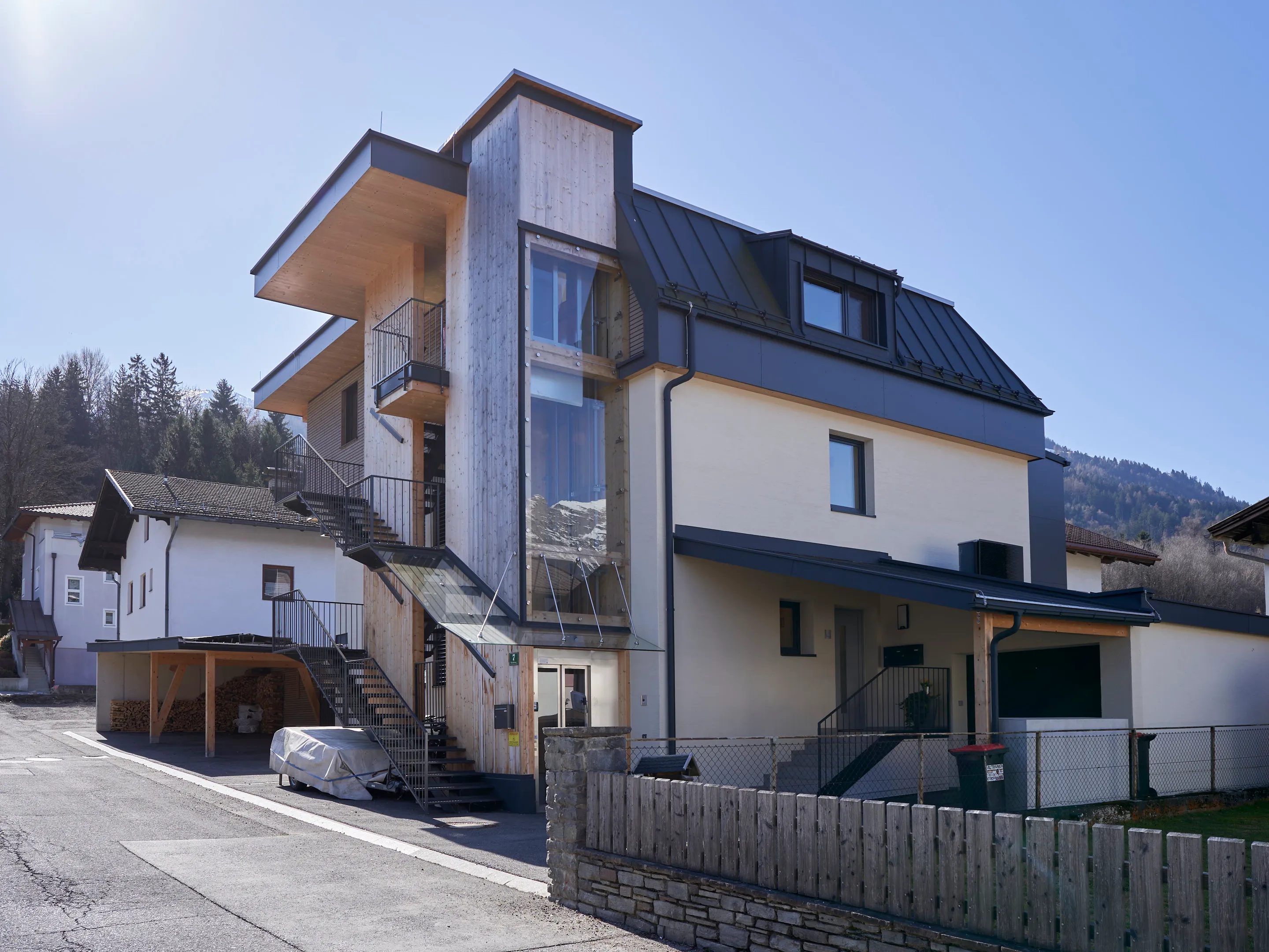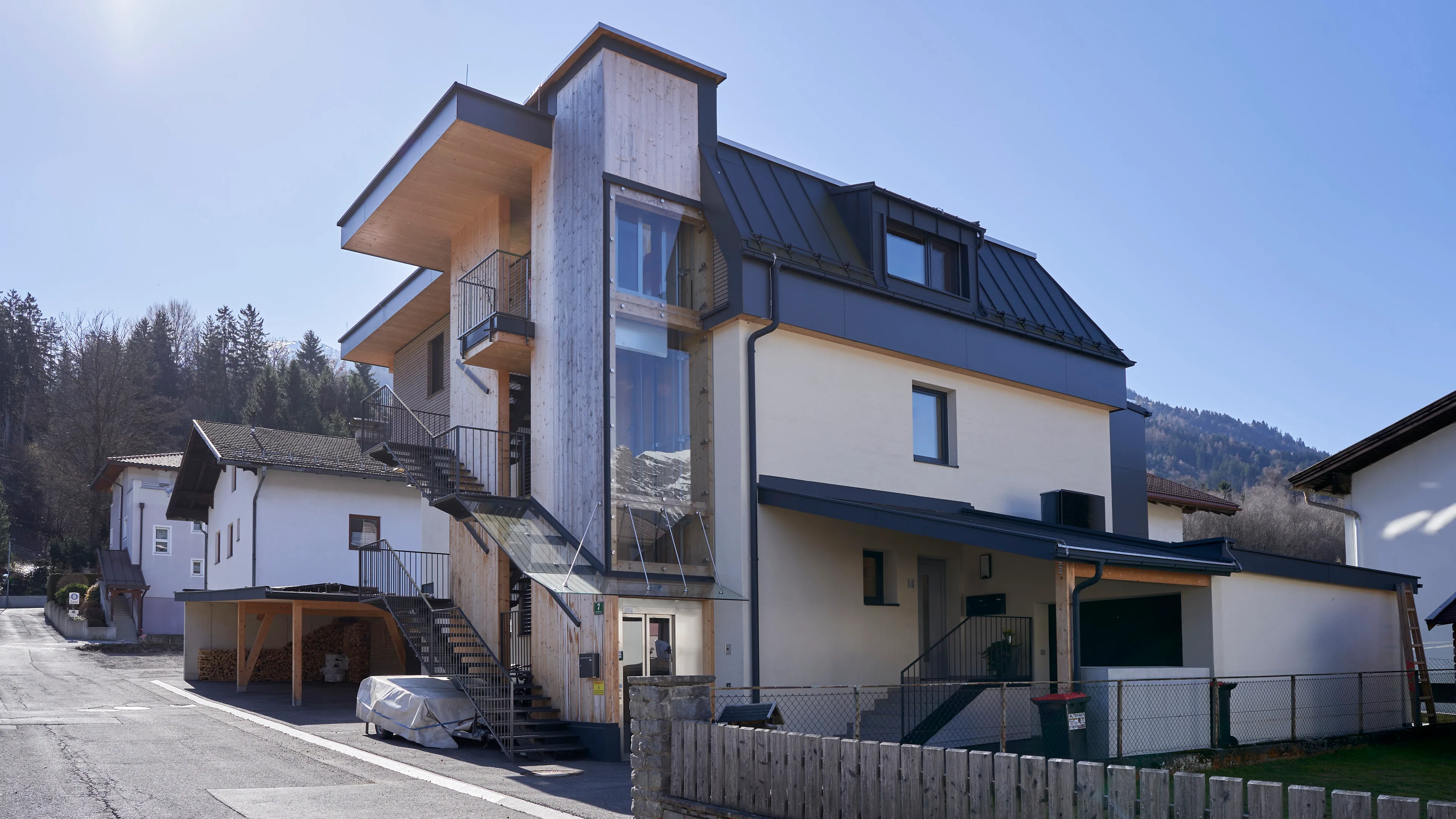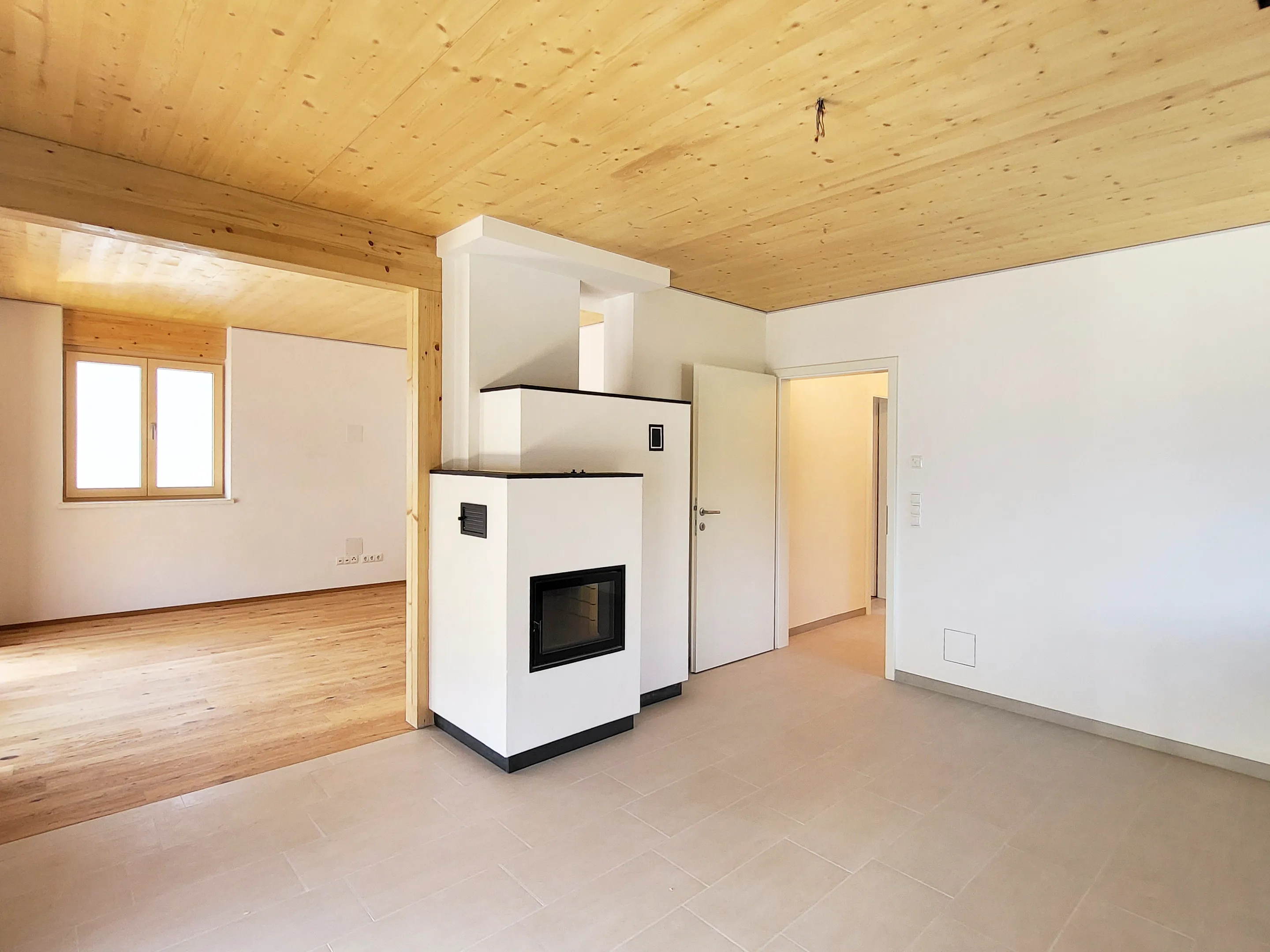Aufgrund der großen Zufriedenheit nach der Errichtung der 10 Wohneinheiten am Stanglweg beauftragte mich der Bauherr auch mit dem Umbau seines Elternhauses. Aus einem Altbau der 60iger-Jahre erblühte hier ein schmuckes Wohnhaus mit drei Wohneinheiten. Auf komplette Ausstattung, Ökologie und Nachhaltigkeit wurde im besonderen Maße Wert gelegt. Sämtliche neuen Bauteile wurden in Holzbauweise ausgeführt. Die Wohnungen verfügen zusätzlich zur Fußboden-Zentralheizung mit Luftwärmepumpe, über einen hochwertigen Kachelofen. Naturholzparkett, Holz-Alufenster, PV-Anlage, umlaufende LED-Beleuchtung, bodenbündige Duschtassen und Küchen mit Komplettausstattung sind hier Standard. Die Dachgeschosswohnung verfügt zudem über einen eigenen Aufzug.