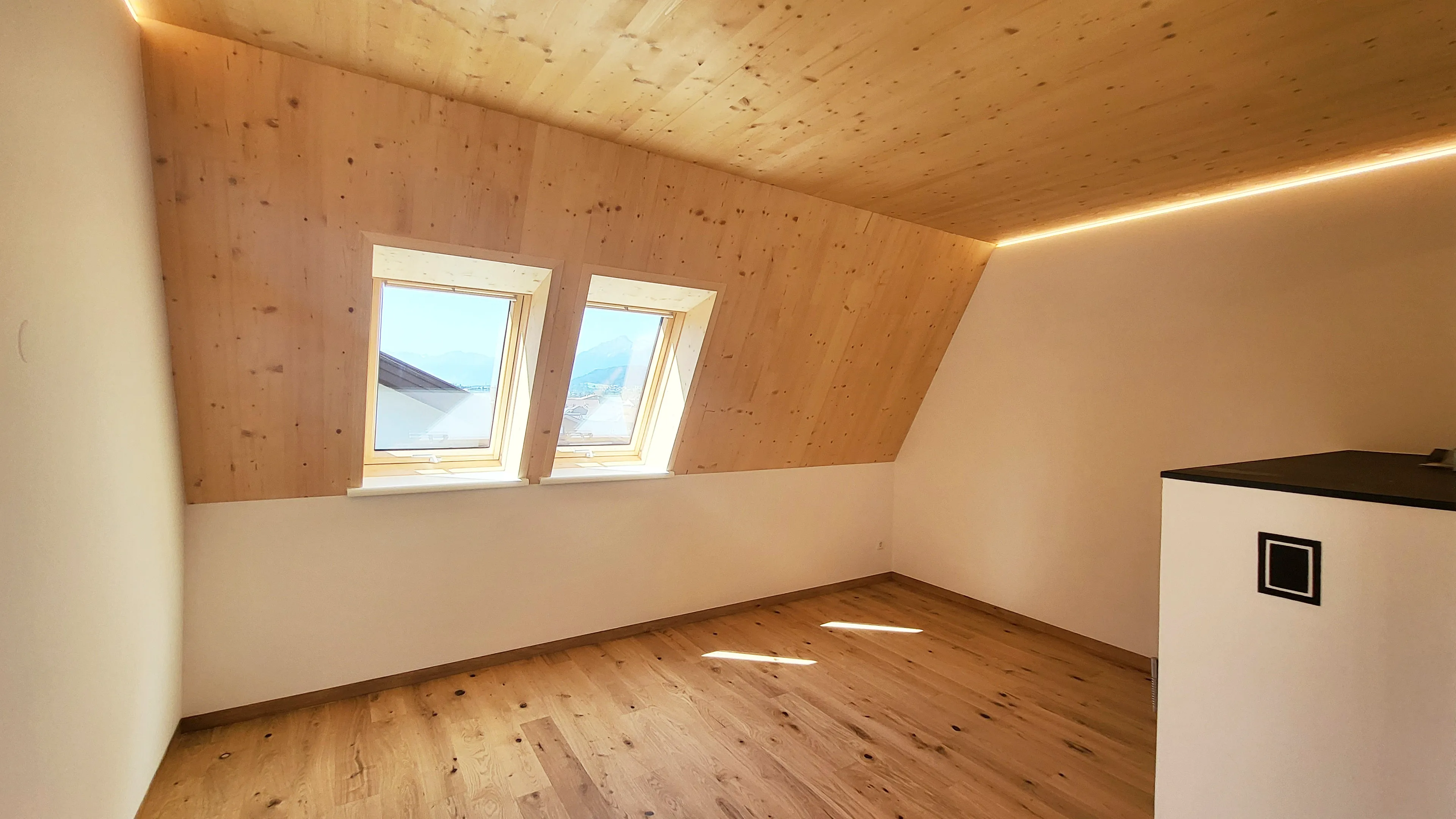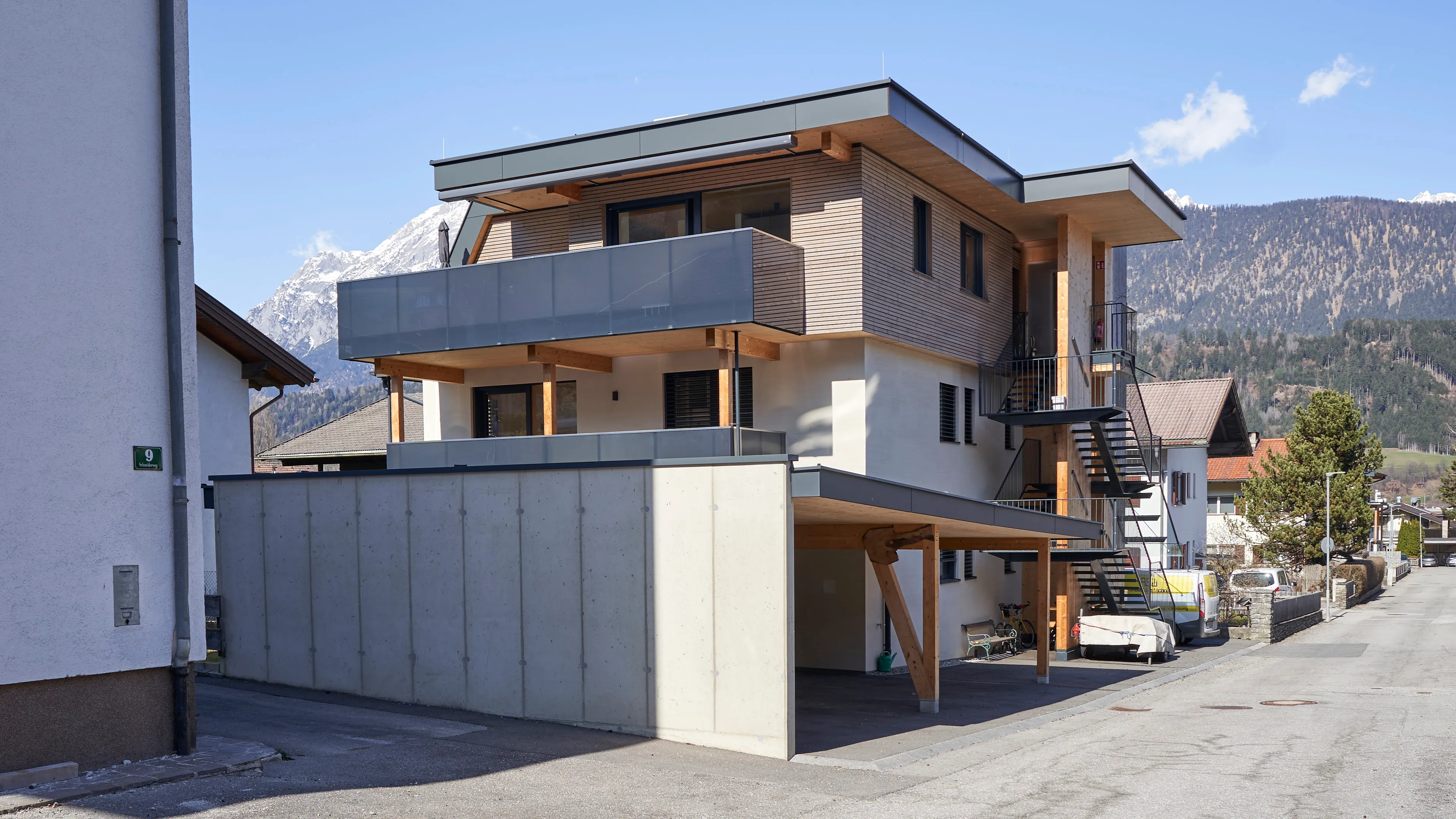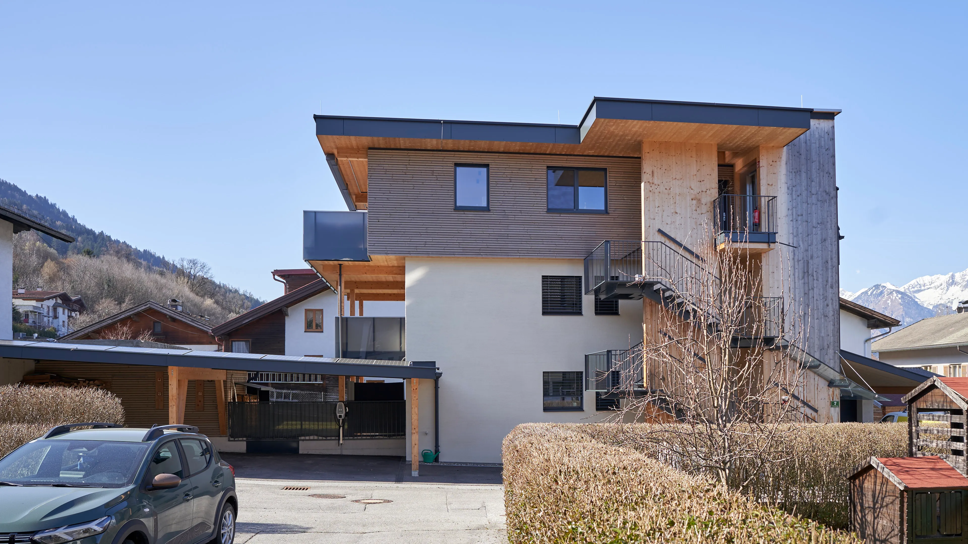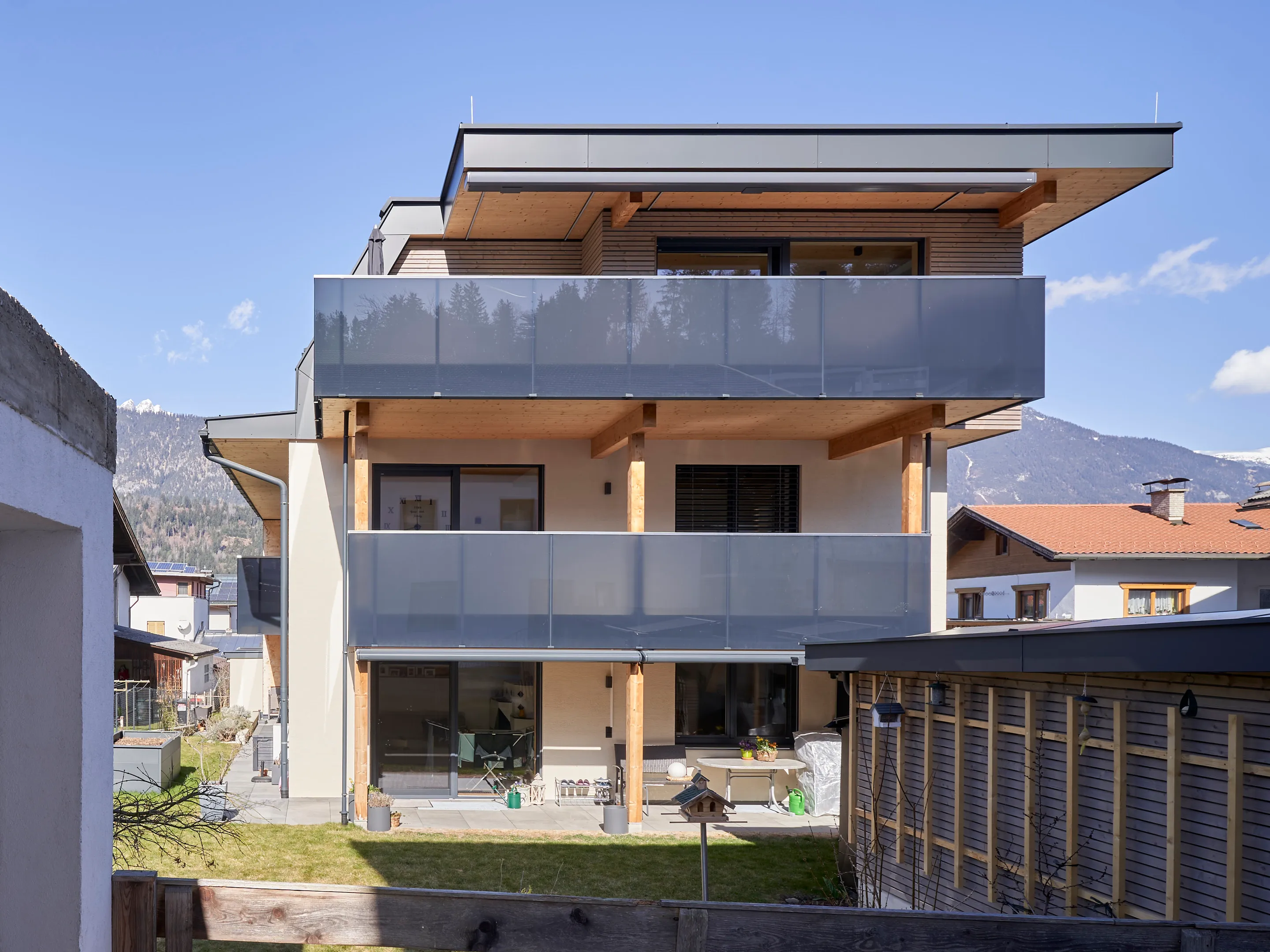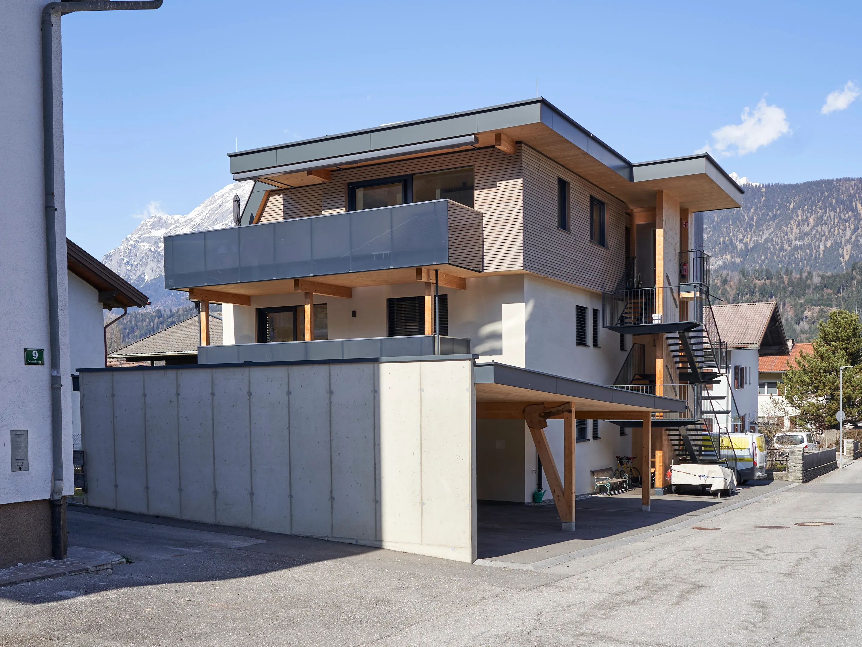 Aufgrund der großen Zufriedenheit nach der Errichtung der 10 Wohneinheiten am Stanglweg beauftragte mich der Bauherr auch mit dem Umbau seines Elternhauses. Aus einem Altbau der 60iger-Jahre erblühte hier ein schmuckes Wohnhaus mit drei Wohneinheiten. Auf komplette Ausstattung, Ökologie und Nachhaltigkeit wurde im besonderen Maße Wert gelegt. Sämtliche neuen Bauteile wurden in Holzbauweise ausgeführt. Die Wohnungen verfügen zusätzlich zur Fußboden-Zentralheizung mit Luftwärmepumpe, über einen hochwertigen Kachelofen. Naturholzparkett, Holz-Alufenster, PV-Anlage, umlaufende LED-Beleuchtung, bodenbündige Duschtassen und Küchen mit Komplettausstattung sind hier Standard. Die Dachgeschosswohnung verfügt zudem über einen eigenen Aufzug.