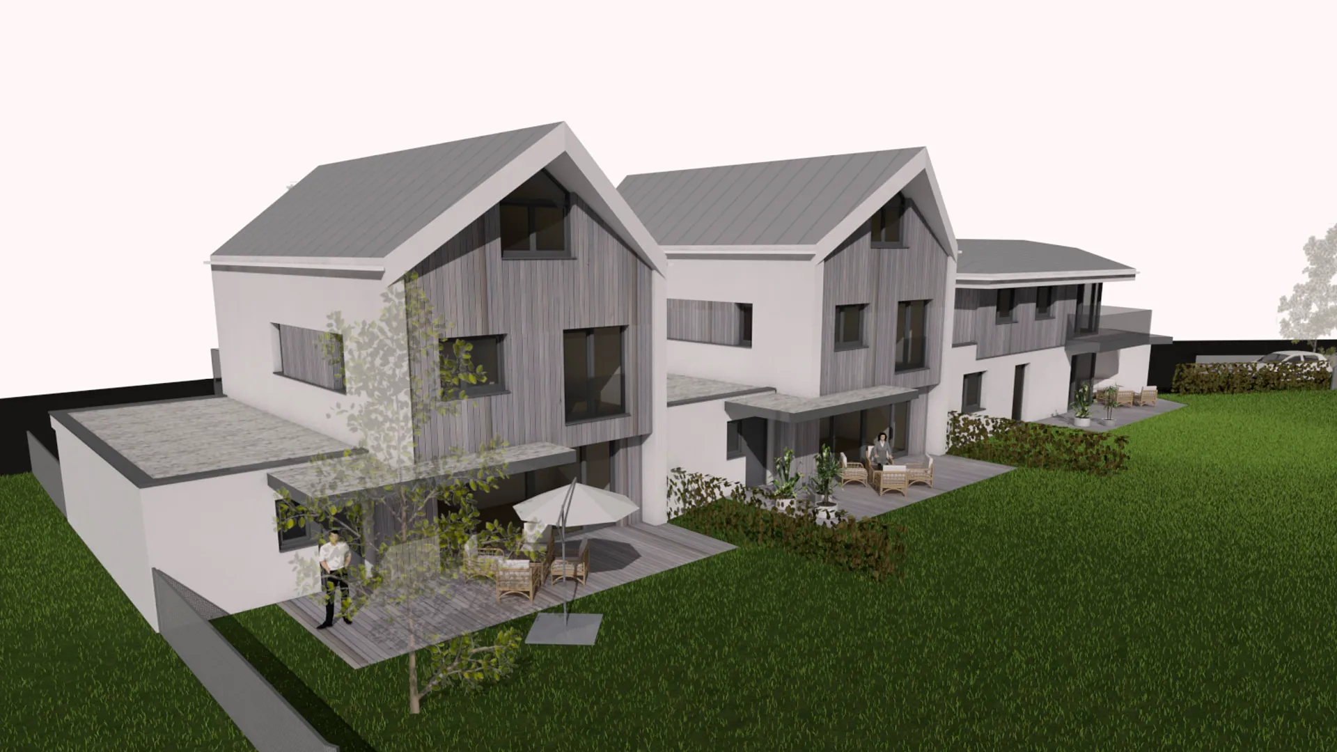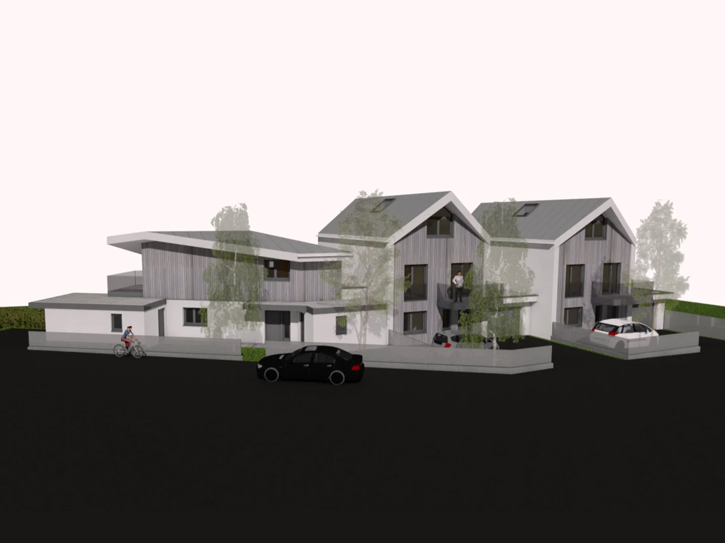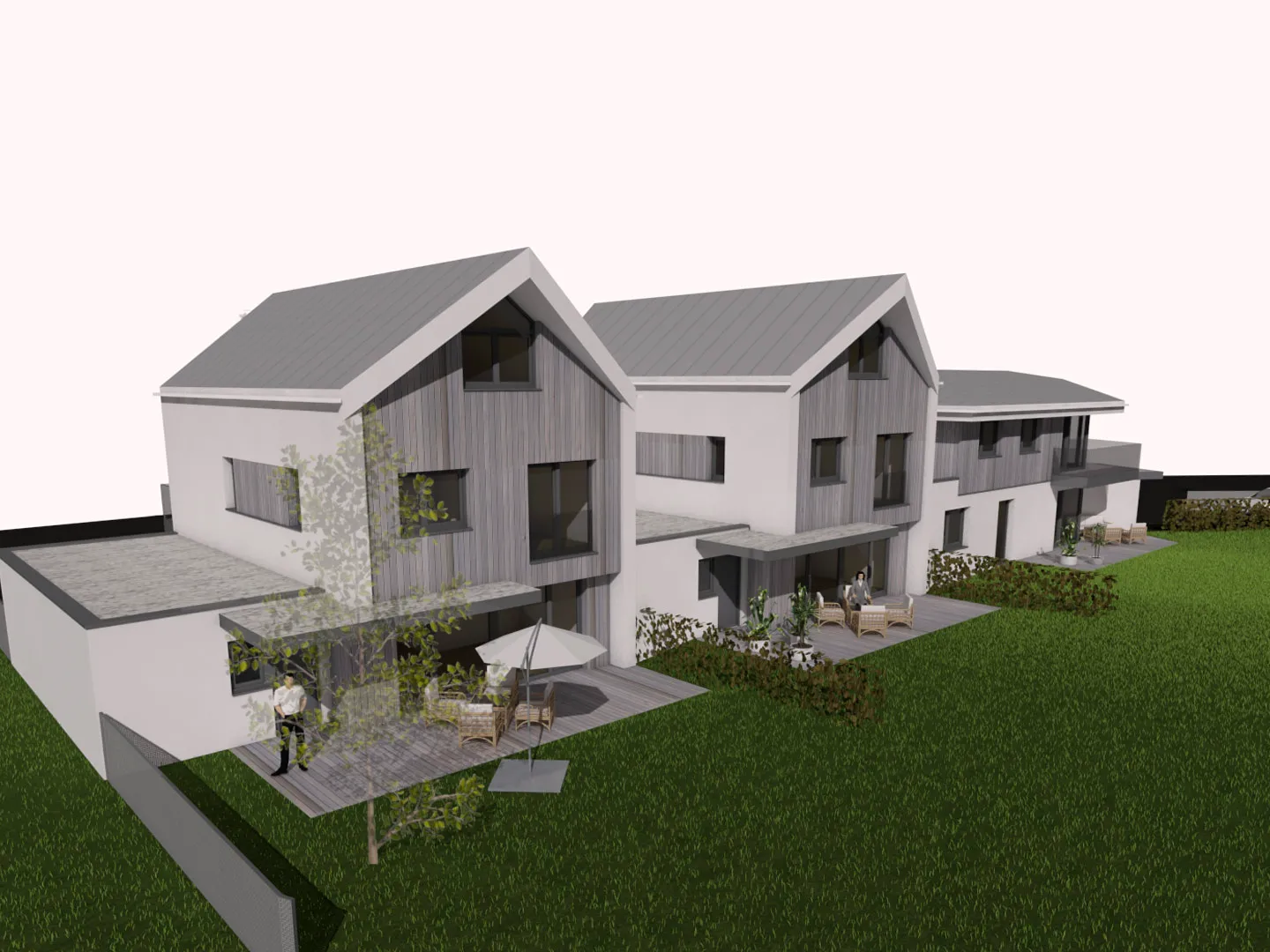 Nachdem für dieses Grundstück schon eine Wohnanlage mit 9 Einheiten geplant war, hat sich der Bauherr entschieden es aufgrund der besseren Vermarktung mit drei Einfamilienhäusern in gekuppelter Bauweise zu bebauen. Das Erscheinungsbild wurde in enger Zusammenarbeit mit der Stadt Hall entwickelt. Eine nicht zu dichte, harmonische Bebauung mit viel Grünfläche wurde angestrebt. Die Grundrisse folgen der klassischen Gebäudelehre, sind aber flexibel und können leicht nach den Wünschen der Käufer umgestaltet werden. Ein Baubeginn wird voraussichtlich 2026 erfolgen.