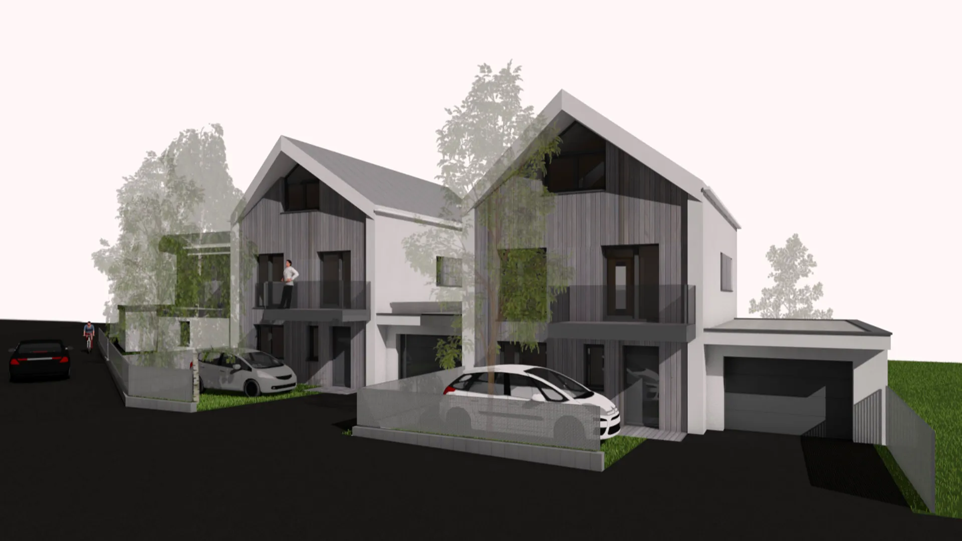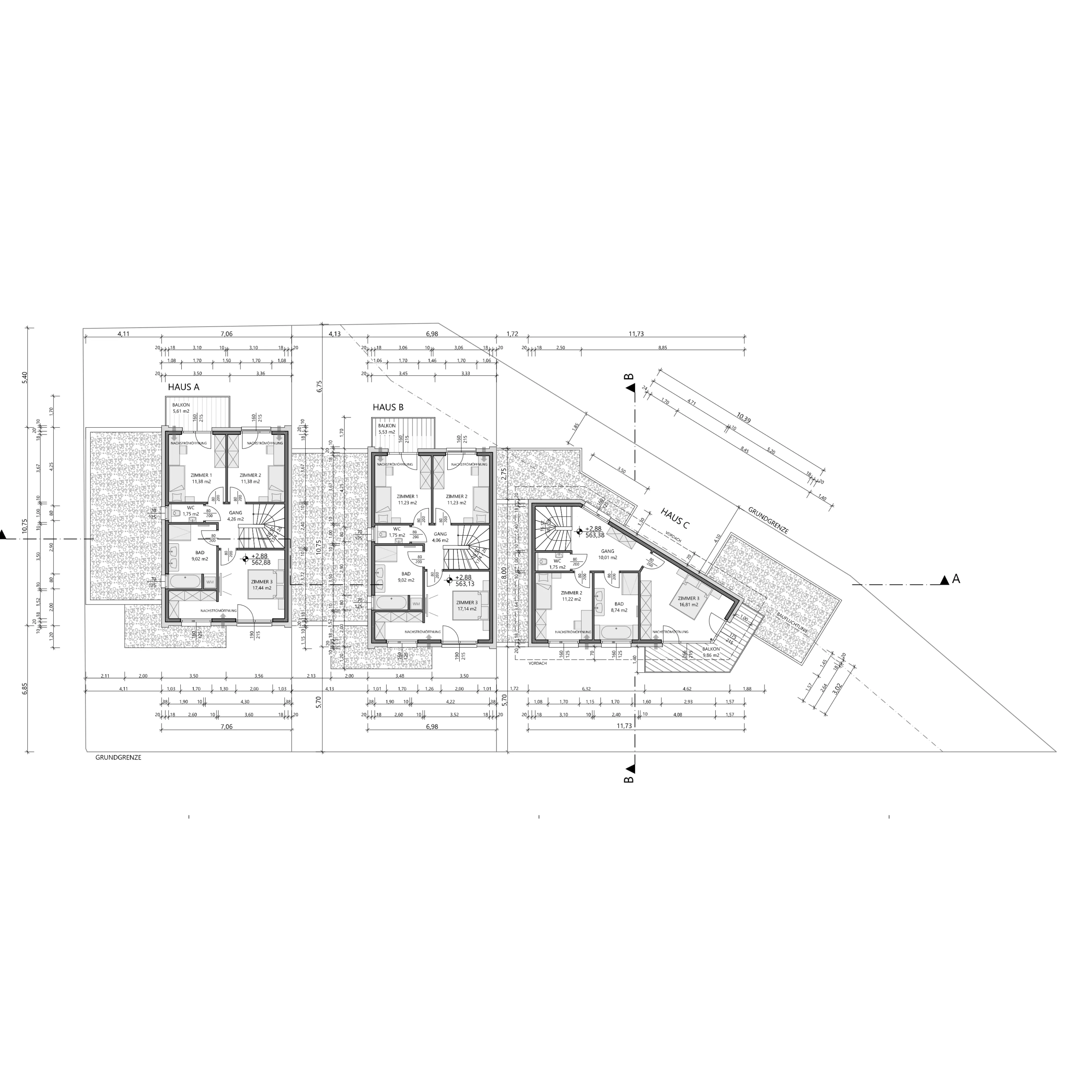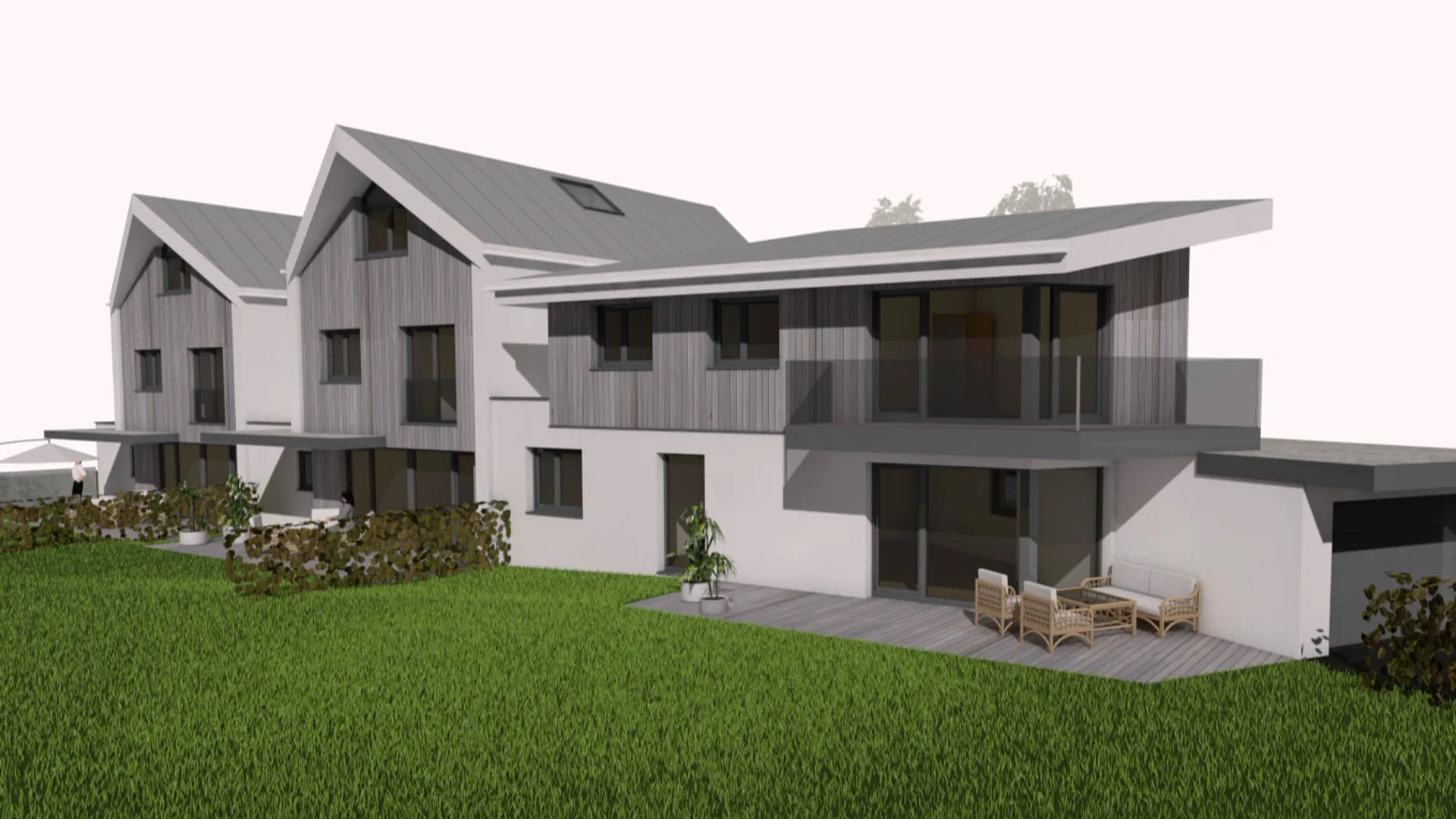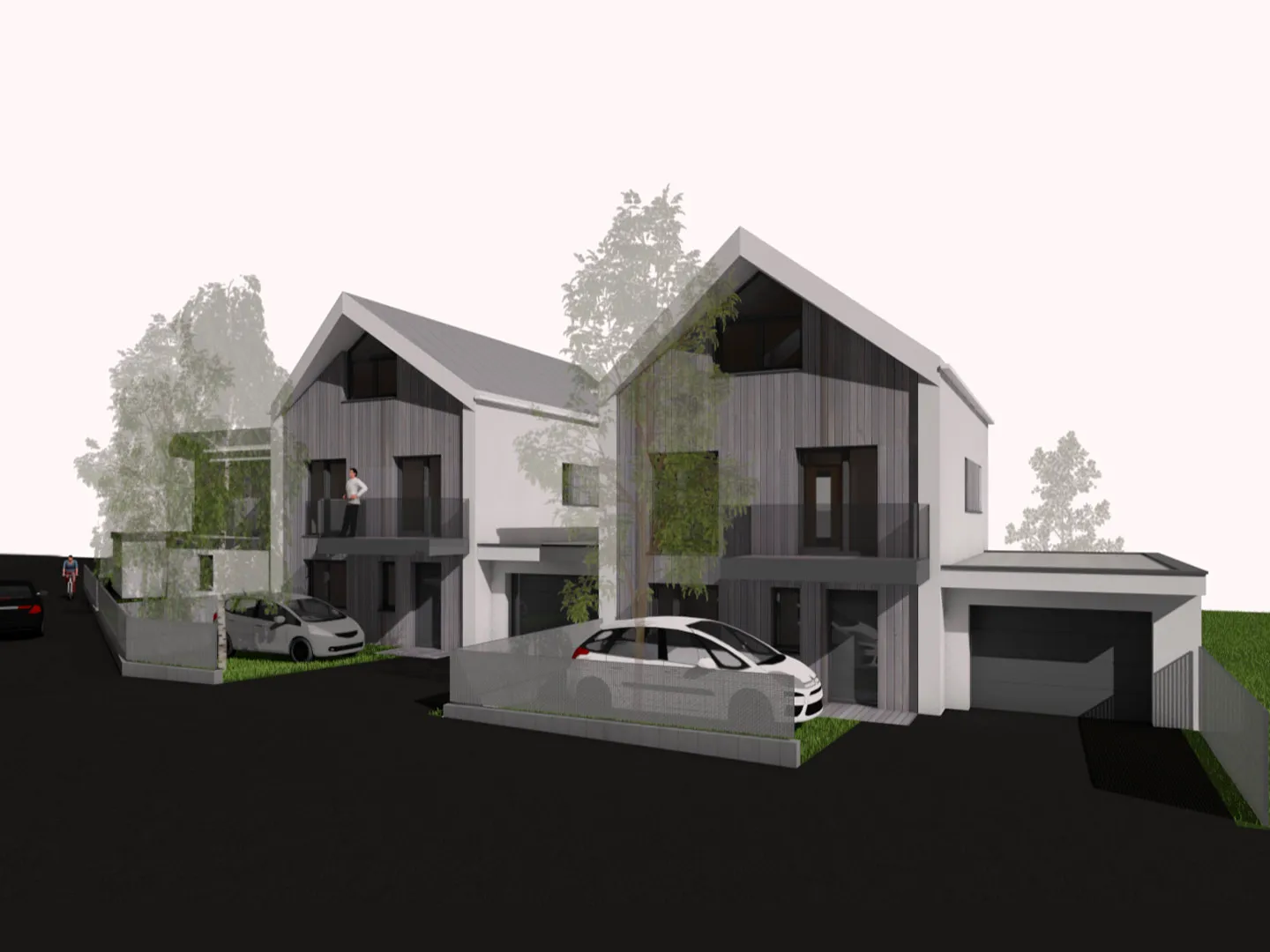 Nachdem für dieses Grundstück schon eine Wohnanlage mit 9 Einheiten geplant war, hat sich der Bauherr entschieden es aufgrund der besseren Vermarktung mit drei Einfamilienhäusern in gekuppelter Bauweise zu bebauen. Das Erscheinungsbild wurde in enger Zusammenarbeit mit der Stadt Hall entwickelt. Eine nicht zu dichte, harmonische Bebauung mit viel Grünfläche wurde angestrebt. Die Grundrisse folgen der klassischen Gebäudelehre, sind aber flexibel und können leicht nach den Wünschen der Käufer umgestaltet werden. Ein Baubeginn wird voraussichtlich 2026 erfolgen.